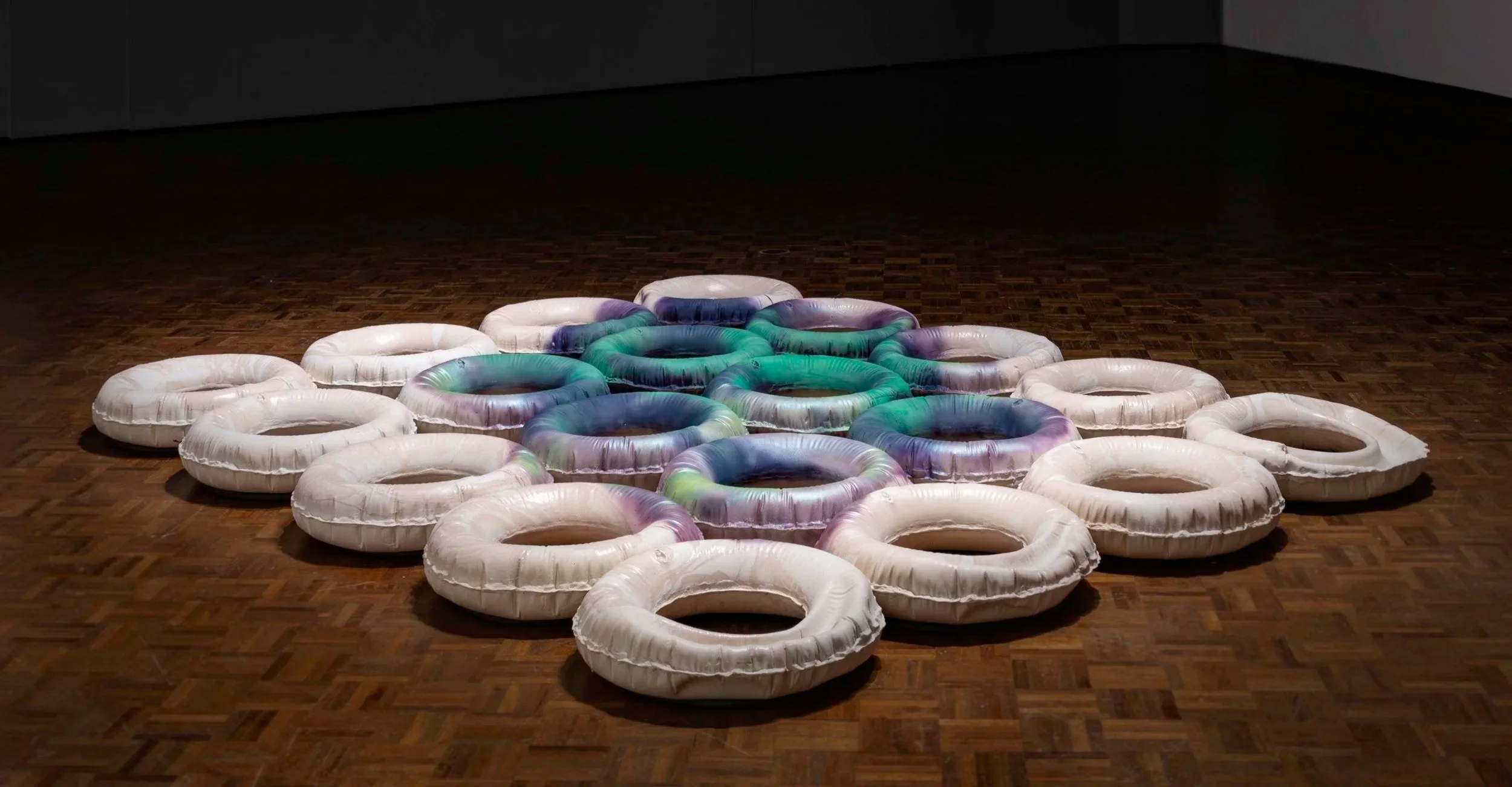 Learning to Not Drown is a three minute long film of a performative sculpture that indulges intimate loss of control through confrontation of the permanence of pain held invisibly within the body. Treated inconsistently with purple to green changing thermal pigment, the surface mimics the appearance of a bruise healing to its later stage colors as my body interacts with the contours of the ceramic cast innertubes. Stand-ins for bodies and derived from life-rings in different stages of deflation, the ceramic inflatables metaphorically represent my personal theory, “learning to not drown.” This is the idea that successfully integrating the pain, trauma, and emotional labor involved in being human is an active survival mechanism and a transformative force.